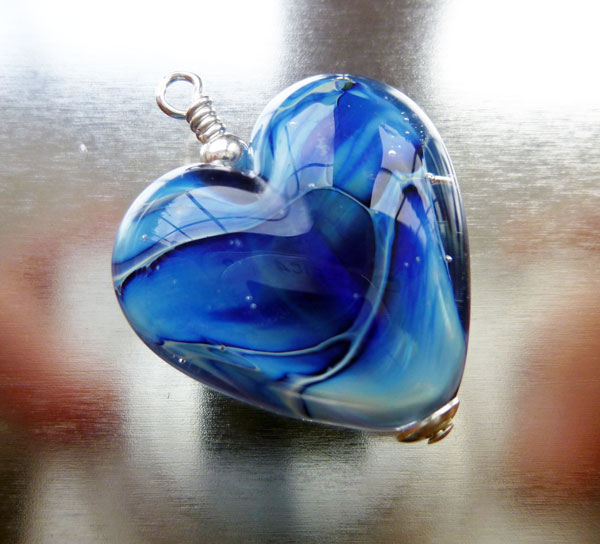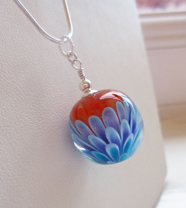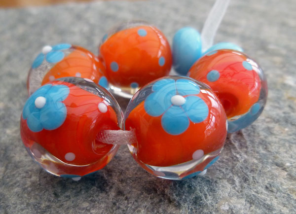 The bloom beads are my favourite. Made by using hair thin pieces of glass formed into dots. Layers of clear glass are wound on top of the dots, which when melted and dragged with gravity, provide the illusion of a floating petal. The colour combinations of this type of bead are endless and although they can take up to an hour each to make, it is so relaxing to do so.
